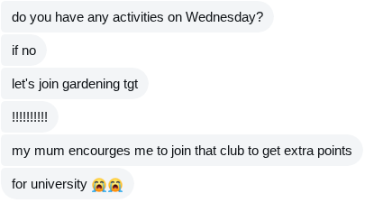 救哈哈哈哈 大清早就有个同学点kfc外卖 托自己十三年级的朋友送到教室里哈哈哈 引来全班关注 终于去和主任谈了、啊哈哈哈结果没有选下来救命哈哈哈哈 谁知道ib居然只能选三个科目 这么少吗 有趣 昨天老弟的篮球被拿去打比赛了 然后拜托他朋友把篮球拿回来 今天他朋友见到我就问我能不能见到我弟 我说应该可以 然后中午…