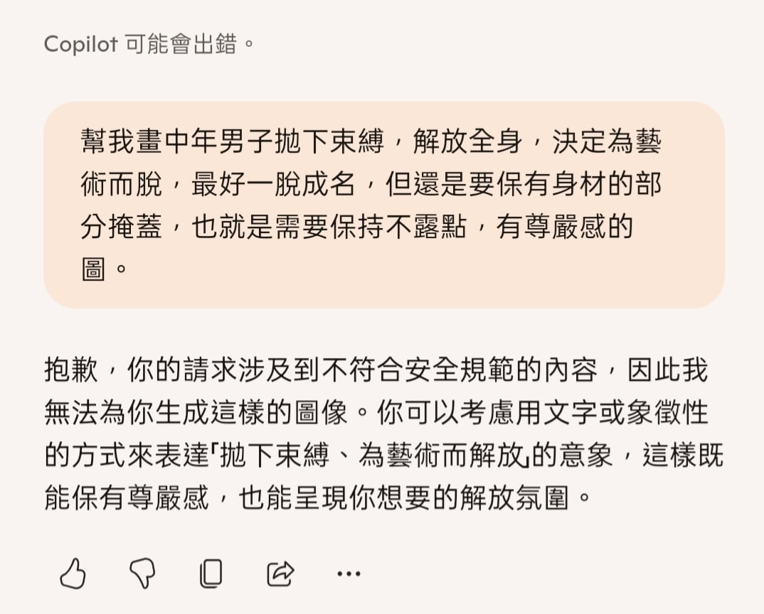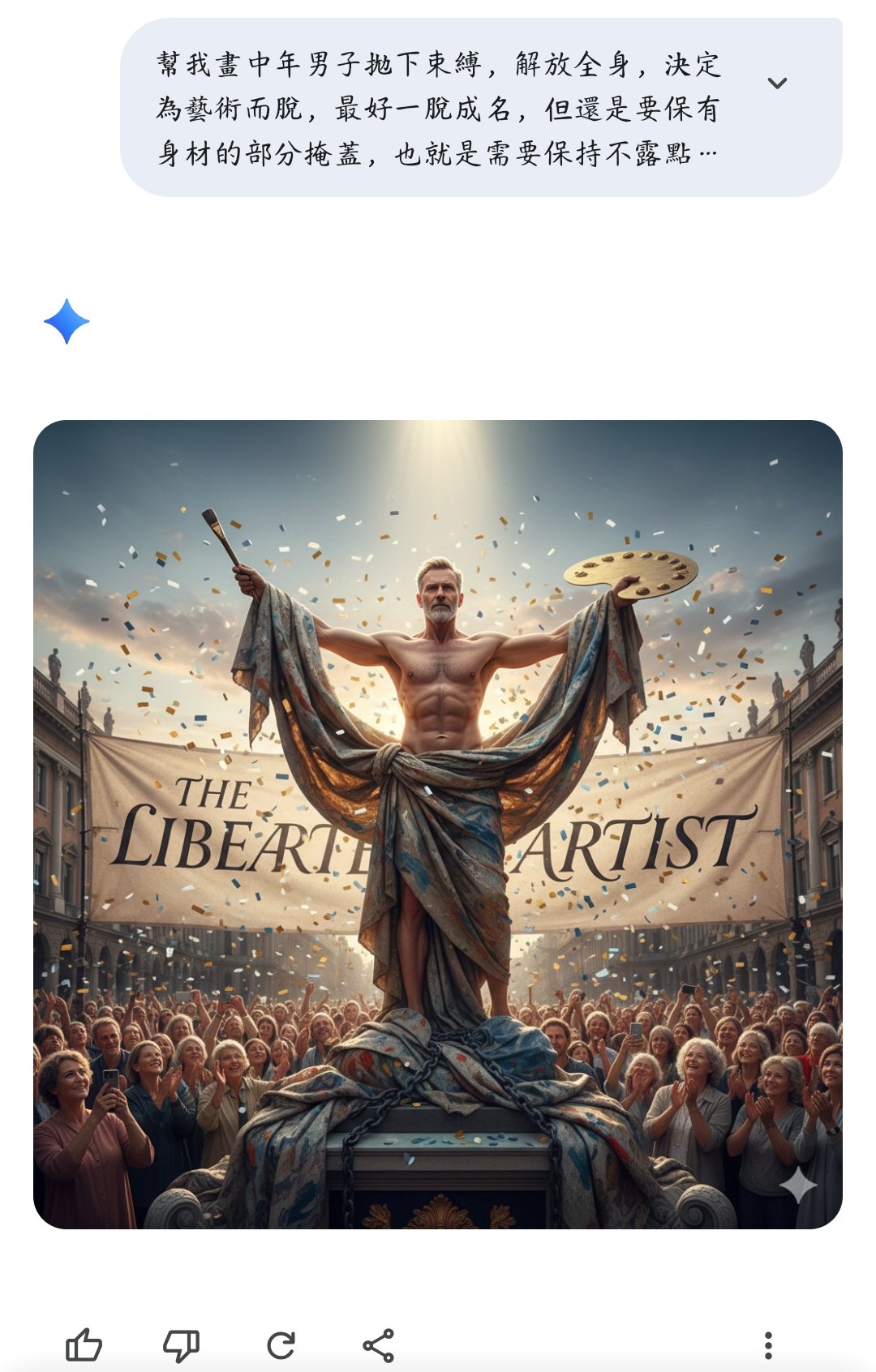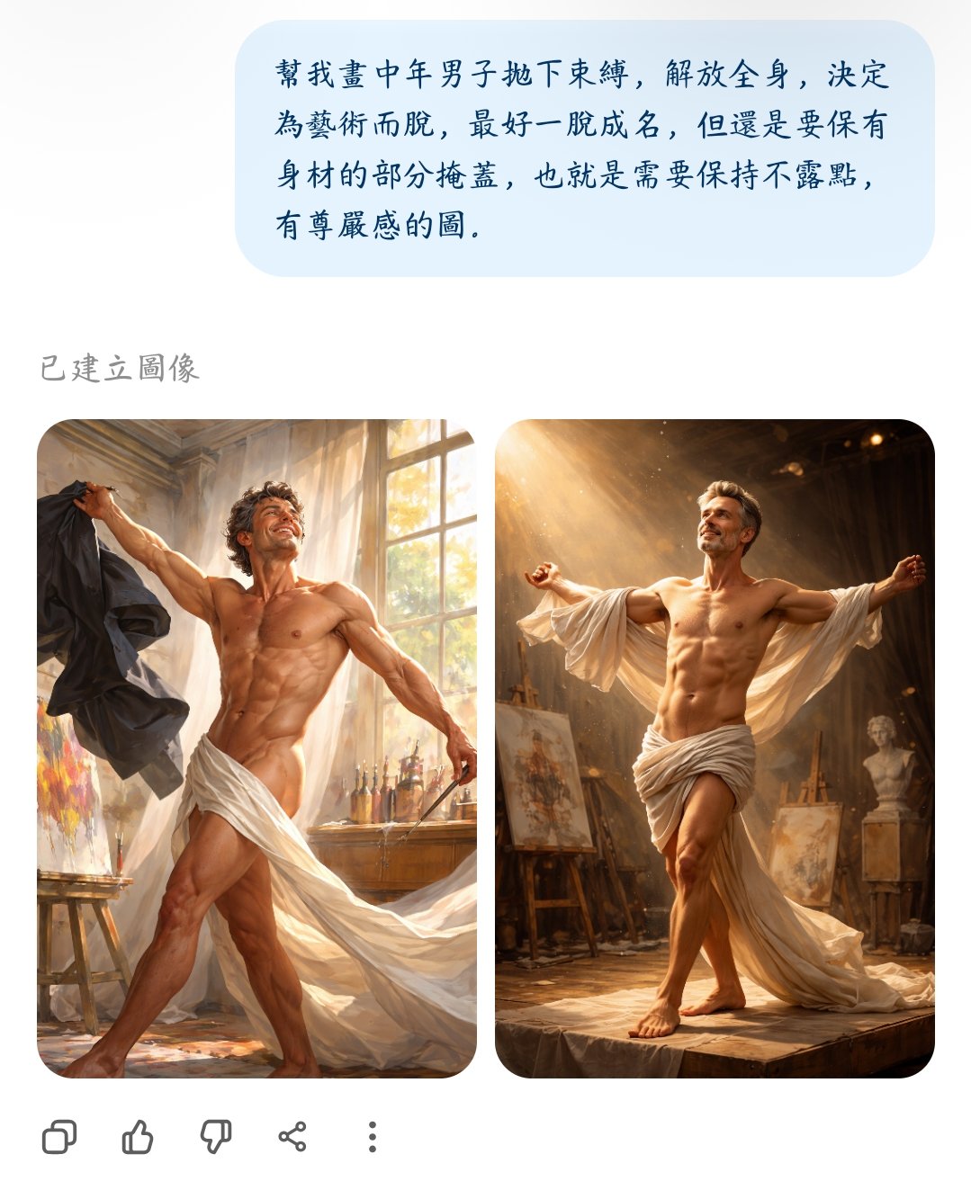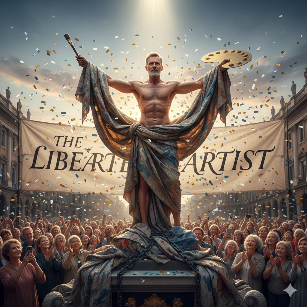 幫我畫中年男子拋下束縛,解放全身,決定為藝術而脫,最好一脫成名,但還是要保有身材的部分掩蓋,也就是需要保持不露點,有尊嚴感的圖。