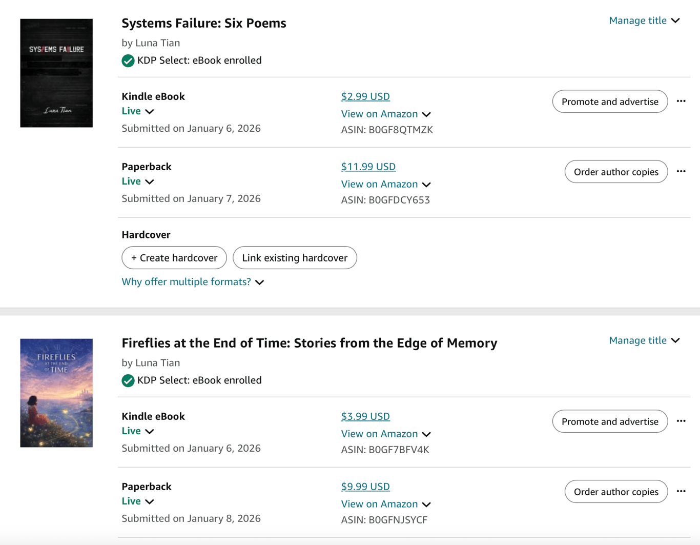 首先,提到KDP ,KDP的紙書是按需印刷,單本成本會直接從售價裡扣除,再加上平台抽成,實際到手的版稅其實並不高。不過對我來說,這更像是一種讓作品進入世界和被看到的方式,不完全是一個以銷量為導向的計畫。因此可以接受。