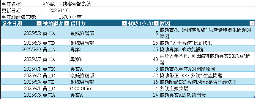 正確的方法是,一旦掌握情報,必須立刻將其轉化為數據,記錄在你的「帳本」內。每當成員回報被某位主管抽調,請像會計記帳一樣,詳細記錄下這筆「資源債」。