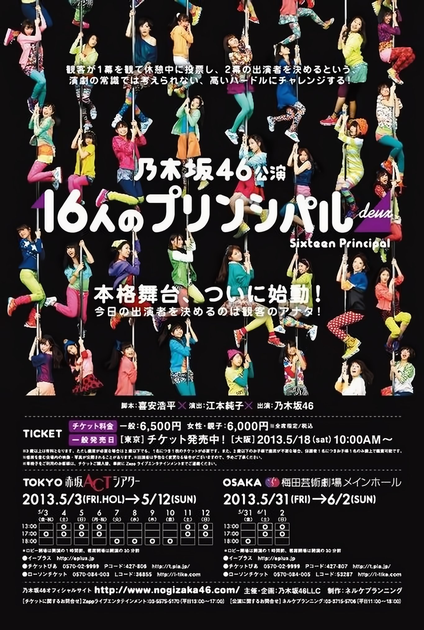 「16人的主角deux」在赤坂ACT劇場公演。是次公演與第一次「16人」有所不同。第二部份的戲劇「乃木坂歌劇團~迷宮花園~」設有十個主要角色供成員選擇參選,另有六個女僕角色。第一部份成員就所選角色進行試鏡,至投票時段由觀眾選出演出者。觀眾亦可不按參選名單投票,因此即使只有一人參選的角色,也不會自動當選。而落選者當中得票最高的六人則負責女僕角色。由於規則的改變,再沒有出現全劇無法出場的成員。而主動選角則讓多位有志於戲劇的成員展現野心,不斷挑戰選取新角色。上次表現出色的生田和髙山,今次分別勝出7角及6角。上回陷於苦戰的若月強力反彈,全部10角均挑戰成功。而於去年4單大受打擊,決心全力再戰的西野,令人意外地成為另一位全攬10角的成員。公演期間每天公佈一名二期生,共計13人,其中包括原屬AKB48第8期研究生的西川七海,她們將作為研究生展開活動。乃木坂46的總人數首次達到與團名相符的46人。