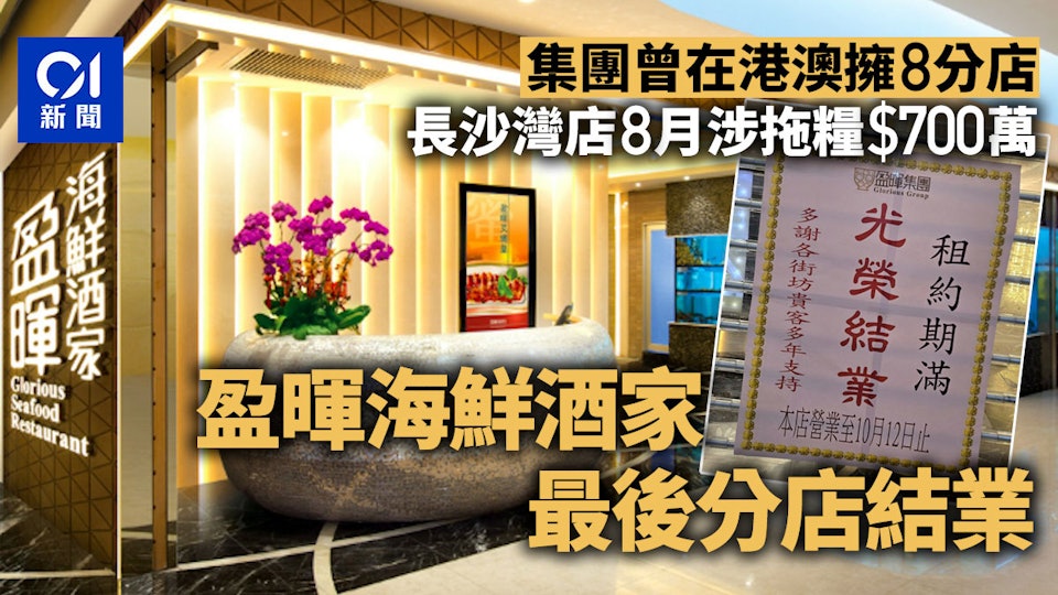 鴨脷洲海怡半島海怡西商場的「盈暉海鮮酒家」,日前公布因租約期滿結束營運,營業至周日(12日)為止。其門外現時已貼上相關告示,並感謝顧客多年來的支持。該集團另一家位於長沙灣的分店,亦已於8月結業,隨著該店已於周日結業,意味該酒樓在港所有分店均已結束營運。不過,集團位於澳門威尼斯人的分店仍照常營業。當時飲食業職工總會表示,正協助長沙灣分店逾50位員工到勞工處落案,追討金額約700萬元,涉及7月薪金、遣散費、代通知金、年假、休息日等。