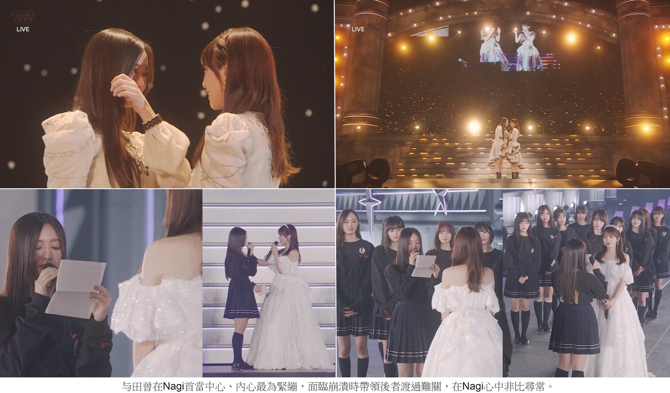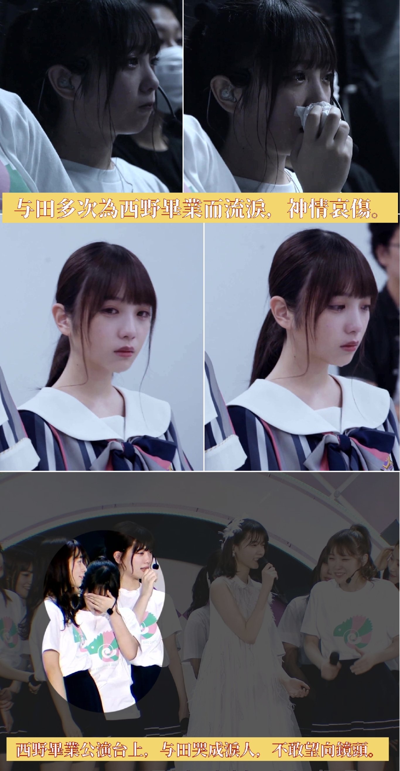 然而即使如此樂天的她,也有情緒失控痛哭的時候,就是當要和所愛的姐姐西野七瀬分開的時候。由於小七在向隊友宣佈畢業決定之前,未有預先告知与田,突如其來的消息過於震撼,深邃的情感一下子破防湧出。此後無論是最後的唱片大賞和紅白舞台,以至小七的畢業公演,与田都近乎失控地痛哭,可見二人相交時日雖不算很久,感情卻着實深厚。所以當我們看到個性內斂的小七,在十周年的後台瞥見与田時,竟然主動撲上前招呼對方,也就不會太過詑異了。畢竟這小不點可是天下第一啊!