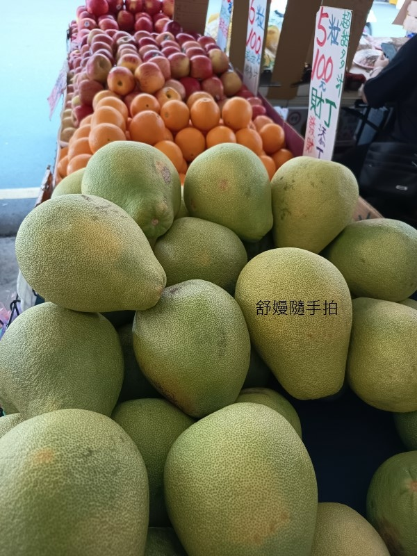水果攤有柚子、蘋果跟柳橙,可和月餅搭配敬拜菩薩和祖先。