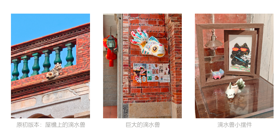滴水兽是福建番仔楼的一种排水构件,是小鱼儿的形状,屋顶的雨水会沿着鱼嘴处落下,避免积水。这也成为了当地的一种文创形象。