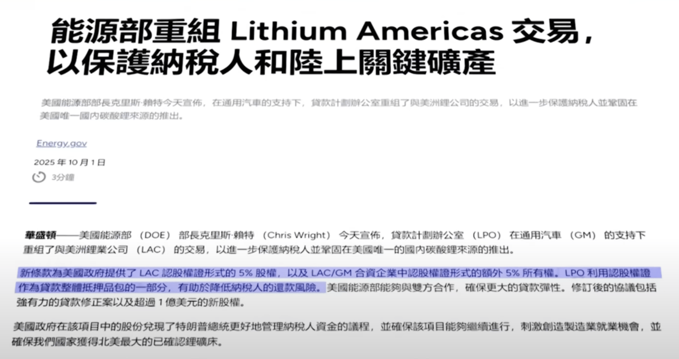 消息透露,川普政府當時正在考慮兩個前所未有的舉措,第一,直接收購LAC最多10%的股權,成為其重要股東;第二,對此前拜登政府已經批准的22.6億美元能源部貸款進行重新談判,將股權與貸款條件綁定。