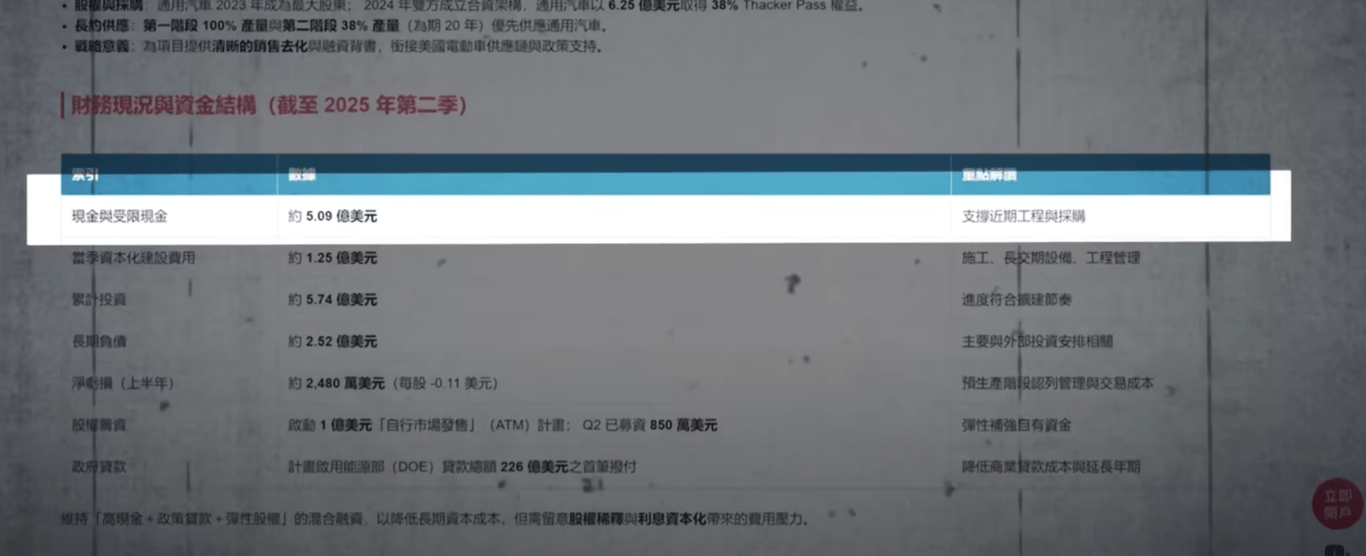 整個計畫預估總投資約30億美元。截至今年第二季末,LAC帳上現金有5.09億美元,已經從Orion Resource Partners融資了2.2億美元,再加上通用汽車的投資。當然最重要的,還是美國能源部那22.6億美元的貸款。