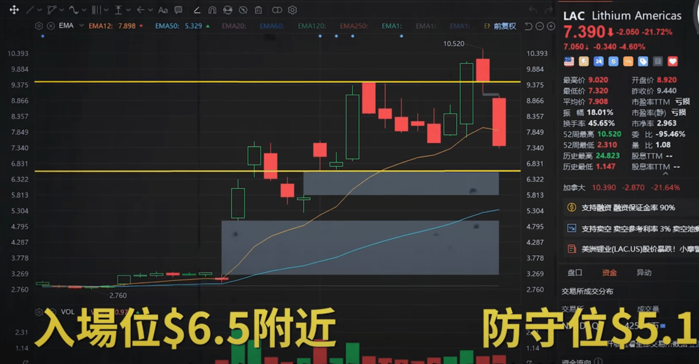 首先從技術層面分析LAC,股價短期的上漲動能非常強勁,入場位我們可以設置在上一個缺口的上沿支撐位置6.5美元附近,進行初步建倉,這是一個高勝率高盈虧比的入場點位。