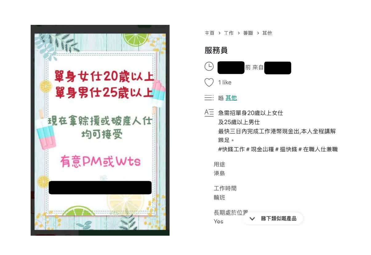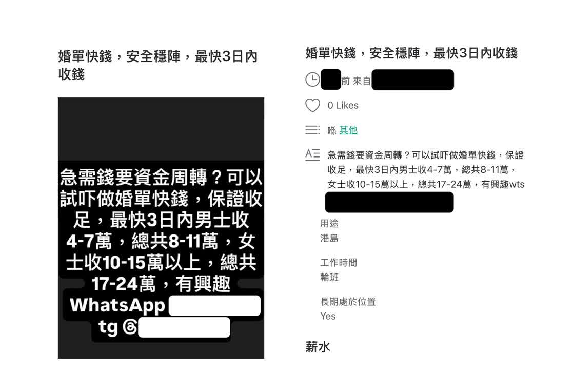 「一個跨境假結婚犯罪集團,利用拍賣平台和即時通訊軟件,招攬香港居民與非本地居民進行假結婚獲利,更實行『佣金制』讓參與假結婚的人士招攬更多人參與,集團在兩年間安排了60多宗假結婚個案,涉款750萬元。招攬廣告中,成員以20歲以上女性及25歲以上男性為目標,聲稱可取得達10萬元酬勞,在對話中表示事成後付現金,並且「『絕對安全』。」