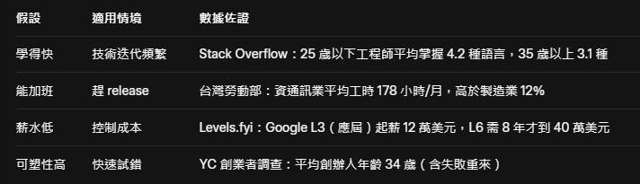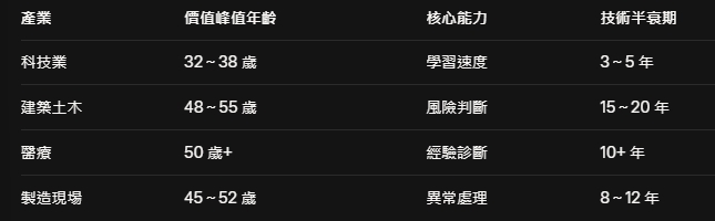 結論:科技業把「學習速度」當 KPI,建築業把「判斷準度」當 KPI。年齡只是代理變數(proxy)。