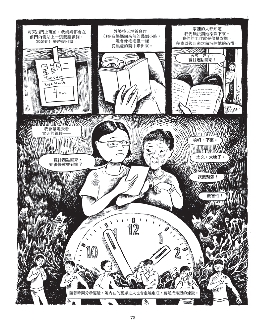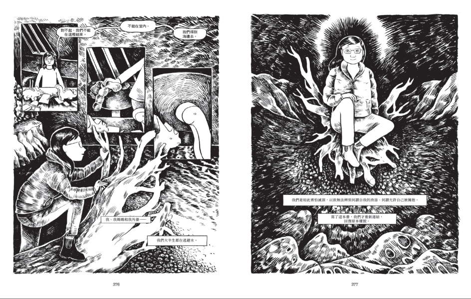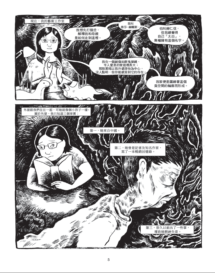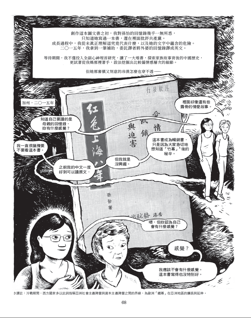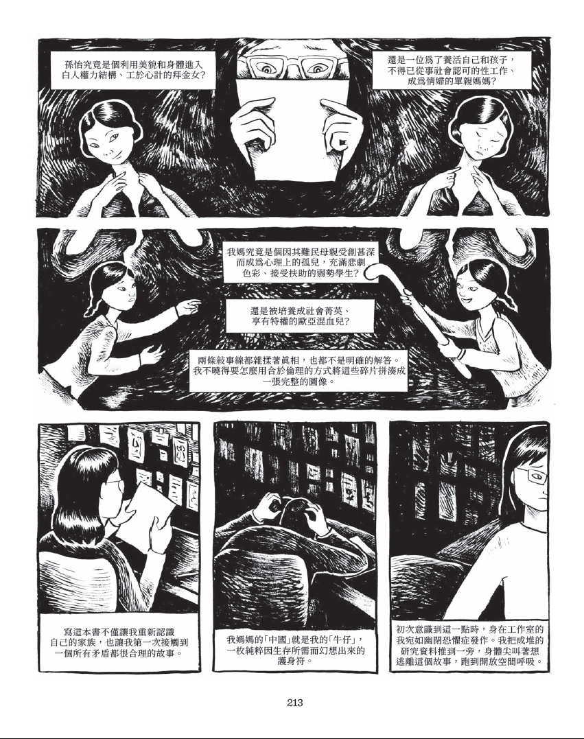 這是一部文字體量不小的圖文書,讀到中途,不免心想:為何作者不將它整理成文字書呢?不是更易於梳理和充分表達嗎?但泰莎接下來的自述回應了我的疑問,她說:「兩條敘事線都雜糅著真相,也都不是明確的答案。我不曉得要怎麼用合於倫理的方式將這些碎片拼湊成一張完整的圖像。」