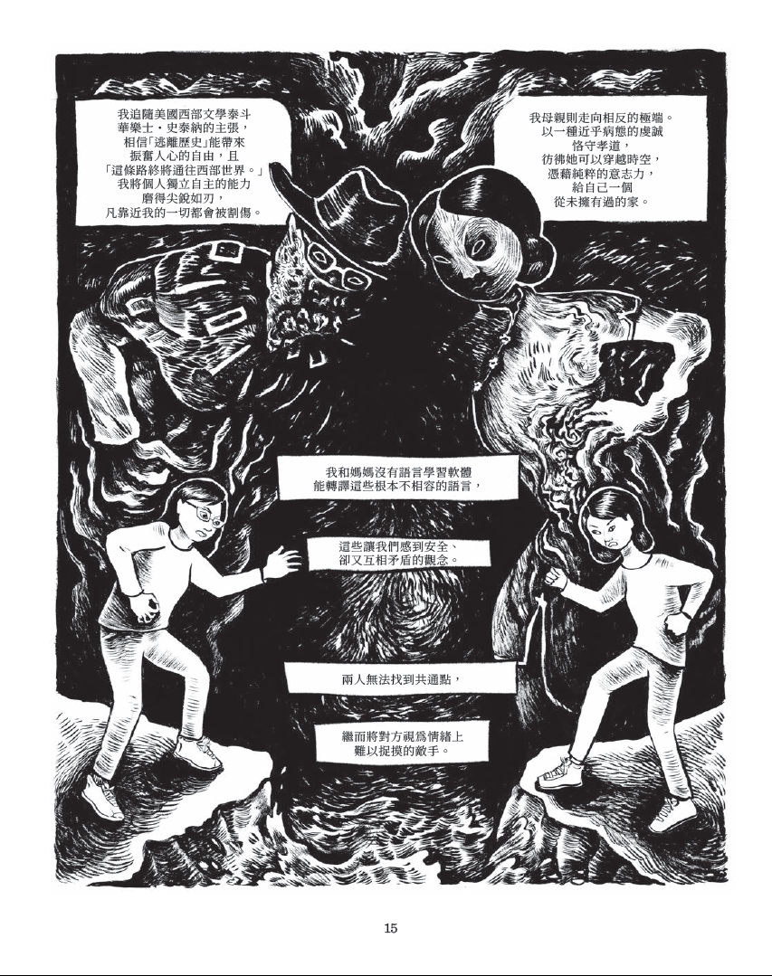 最直觀的例子,就是泰莎與母親的「角色切換」——泰莎的分身是具有美國精神的西部牛仔,而她的母親也有如面具般的黑暗分身。黑暗分身會在某些時刻忽然出現,隨著敘事推進,讀者幾乎可以預知,卻無法抵擋它帶來的衝擊。視覺化的處理,讓容易流於抽象的情感變得更加具體,以承載整本書的主軸:不是充滿記號的歷史,而是難以言述的感覺史。