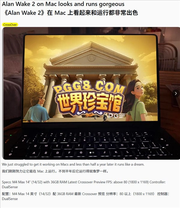 這位名為oyskionline的用戶使用了搭載14核心CPU與32核心GPU的M4 Max晶片的14吋MacBook Pro,透過CrossOver技術成功在macOS上運行原本僅支援Windows的《心靈殺手2》。