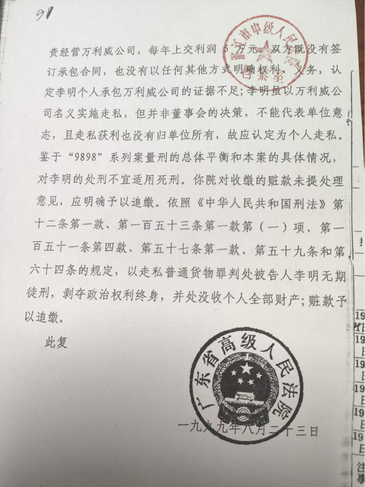 申诉人:李明,男,汉族,19……年生,身份证号码44080……,电话号码……,原系广东省湛江市外贸集团有限公司副总经理,1999年8月25日(即湛江“9898”特大走私案)被判无期徒刑。(原判死刑,广东高院内审不同意判我死刑)