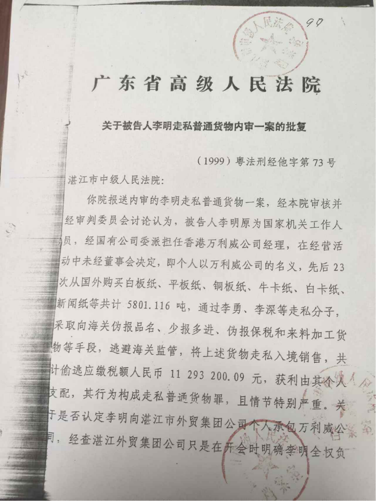起诉方按中纪委中央工作组的指示,从湛江海关拿他人的报关单来起诉我栽赃陷害我,想继续用杀我来威胁逼迫我无罪认罪认下这23船纸张是我的。未果,中纪委又在庭审结束后多次逼供我讲清纸张进口走私的来龙去脉,确认我自己走私的罪行,未果。最终,湛江市中级人民法院,按中纪委中央工作组的指示判我死刑(广东省高级人民法院批复湛江市中级人民法院报送判李明死刑的内审,不同意判李明死刑)。