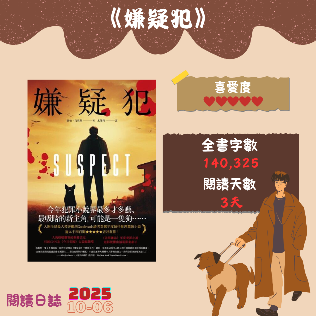 《嫌疑犯》十分好看,一拿起來就不想停下來,而且說起來已是近半年來第一本讓我評5分的小說,真是久違了。
