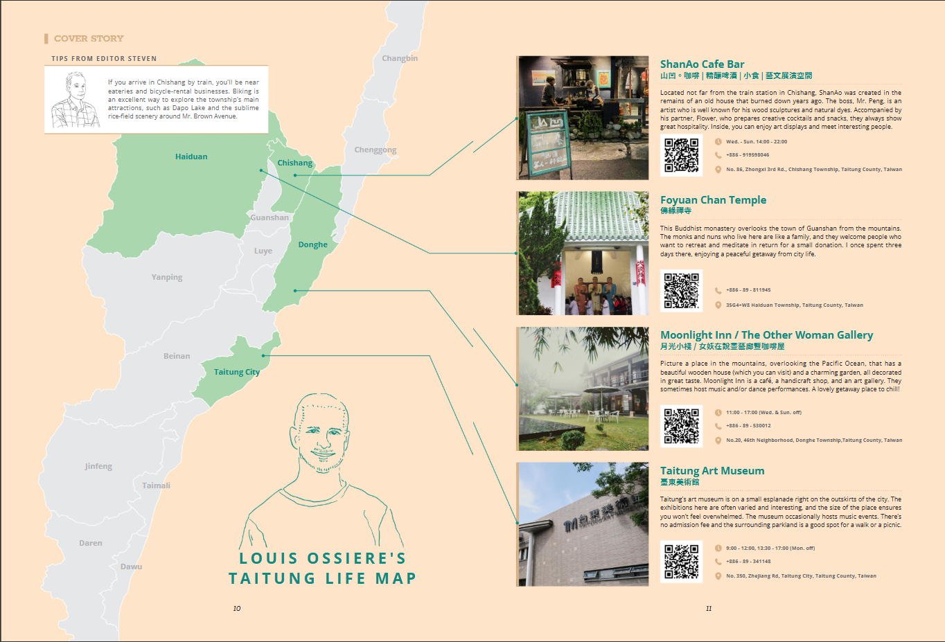 第二年,剛好遇到既有專欄中配合的計畫執行結束了,餘出的頁面要用來做什麼呢? 想到原本就會請作者們推薦台東的店家,之前礙於頁面有限,所以每位作者的推薦只能放一家,現在既然頁數多出來了,不如就每位作者的推薦都多放幾家,用地圖呈現,反映作者的日常活動範圍。