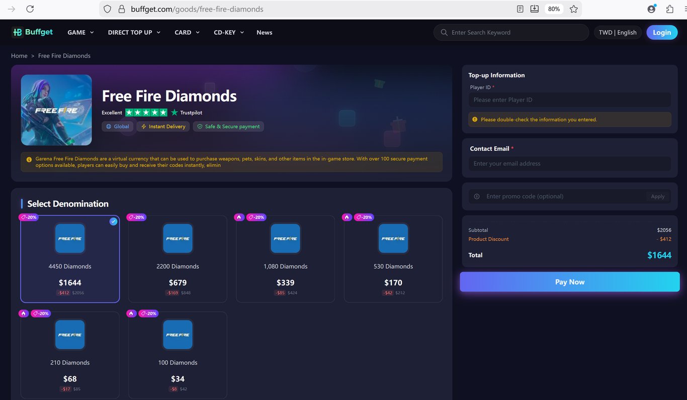 On this site, you can buy Free Fire Diamonds at a much better rate—often featuring an 80% cost efficiency (essentially a 20% discount) compared to traditional top-up methods. Using buffget ensures your FF top up is handled instantly and safely via Player ID. Whether you are aiming for the Stellar Sea Premium+ pass or the new Evo Vault weapons, this is the most reliable way to get cheap Diamonds while maintaining 100% account security.