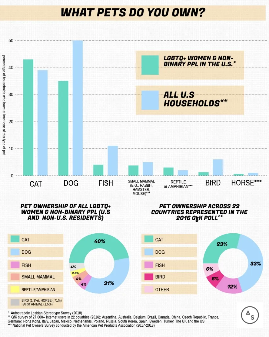 甚至有机构曾统计过酷儿群体中的养猫人士比例,来试图验证 “女同性恋爱猫” 这一刻板印象的合理性,结果表明,女同性恋确实爱猫。