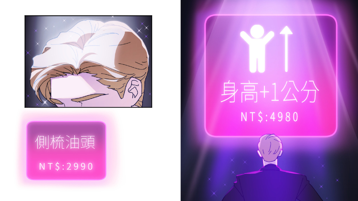 HOM的漫畫《課金派戀愛》中,虛擬實境交友APP「PEENKY」的玩家能夠透過「課金」獲得自己理想中的外貌。創作過程中,在為各種外貌條件標上價碼的瞬間,HOM其實也閃過一絲猶豫——要偷偷反抗嗎?還是順應主流審美?