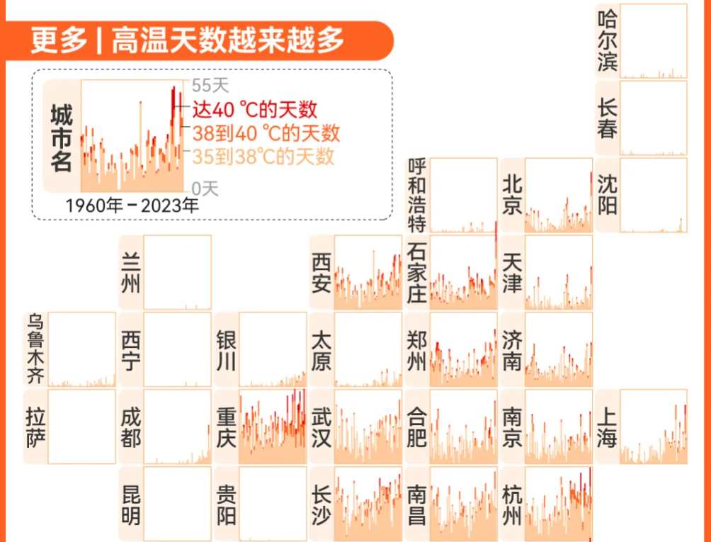 根据《中国气候变化蓝皮书(2025)》,1961年至2024年,我国极端高温和极端强降水事件呈增多趋势。根据中国天气网(1、2)的数据和澎湃新闻的信息汇总,近几十年来,中国城市的高温日变得更多、更热、更早,暴雨和大暴雨天气过程的持续时间也有增加的趋势。今年的异常天气在6月已初露迹象。6月,全国平均气温21.1℃,较常年同期偏高0.9℃,与2022年并列为1961年以来历史同期第一。全国平均降水量85.8毫米,较常年同期偏多3.4%,长江中下游地区降水偏多5成至2倍。7月,北京出现特大暴雨,24日-28日间,全市最大降水量543.4毫米,相当于四天下了近一年的雨。