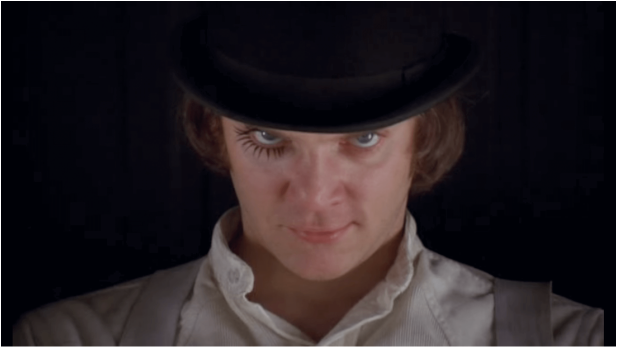 或许最有名的凝视就是“Kubrick Stare”。这是一种电影中用来刻画精神失常或情绪不稳定角色的技巧。演员的目光会从眉心下方位置向外勾起,并将头倾斜朝向镜头。很多影评人说库布里克的凝视能够打破“第四面墙”,引发观众的恐惧、不安。其中最有名的例子就是在《发条橙》里亚历克斯的凝视。