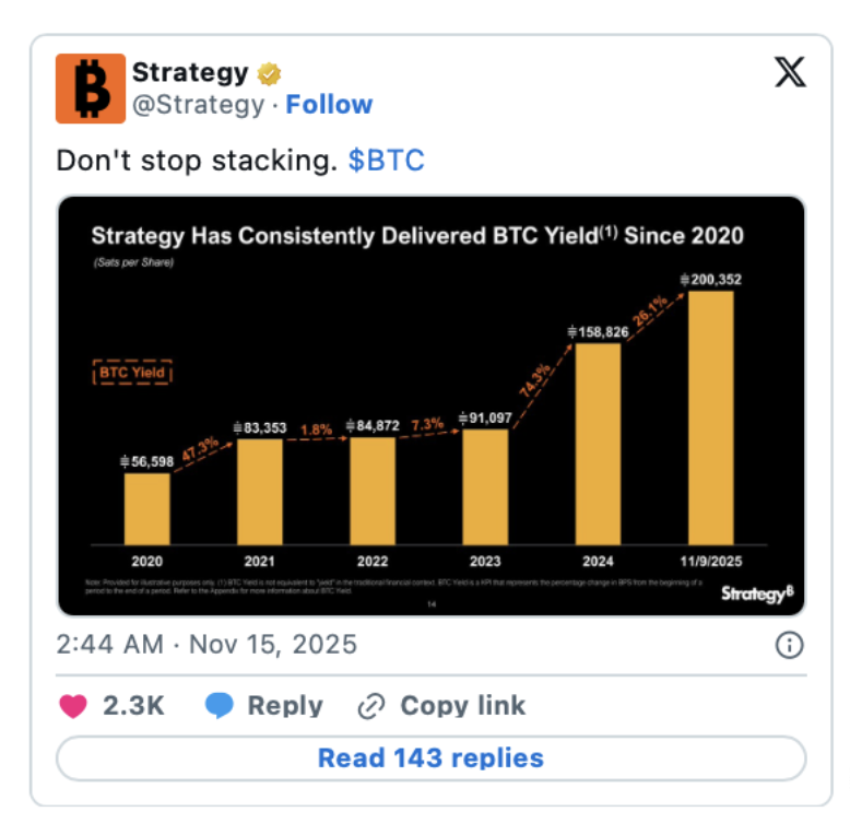 不過,多頭這邊也不是完全沒聲音。全球持幣量最大的上市比特幣持有方 再次公開表示,即便在本輪回檔中,仍在持續逢低增持 BTC,釋放出一個強烈信號:真正的長期信仰者,把這次下跌視為比特幣週期性調整的一部分,而不是牛市終結,而這類資金往往才是下一輪行情的主導力量。
