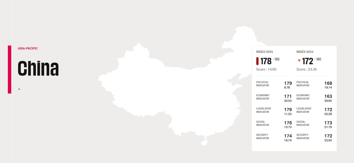 总部位于法国巴黎的无国界记者组织(RSF)发布的《2025年世界新聞自由指數》(World Press Freedom Index)显示,中国排名下降六位,在180个国家中排名第178,仍是全球关押记者人数最多的国家,目前有123名记者被羁押。此外,香港排名也跌至第140,同样归入“状况恶劣”类别。