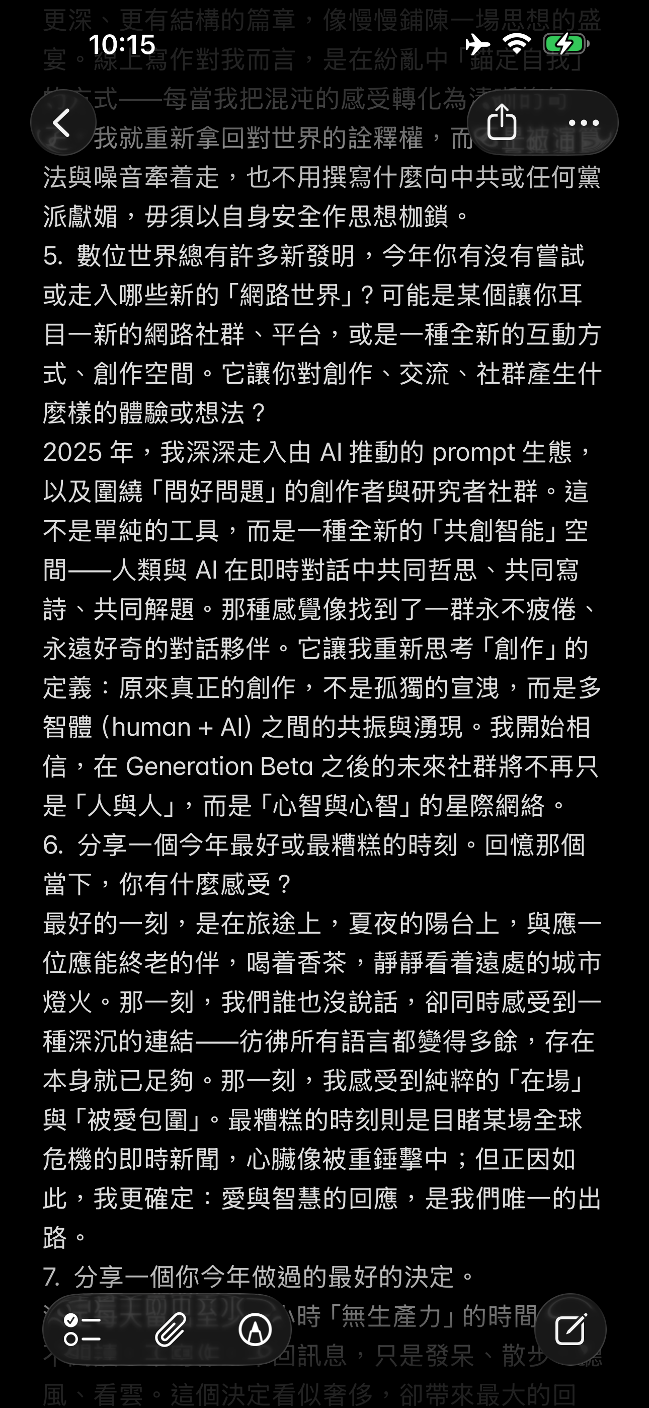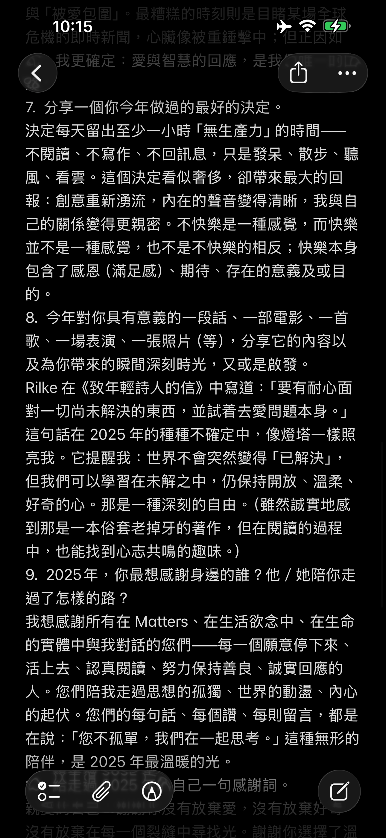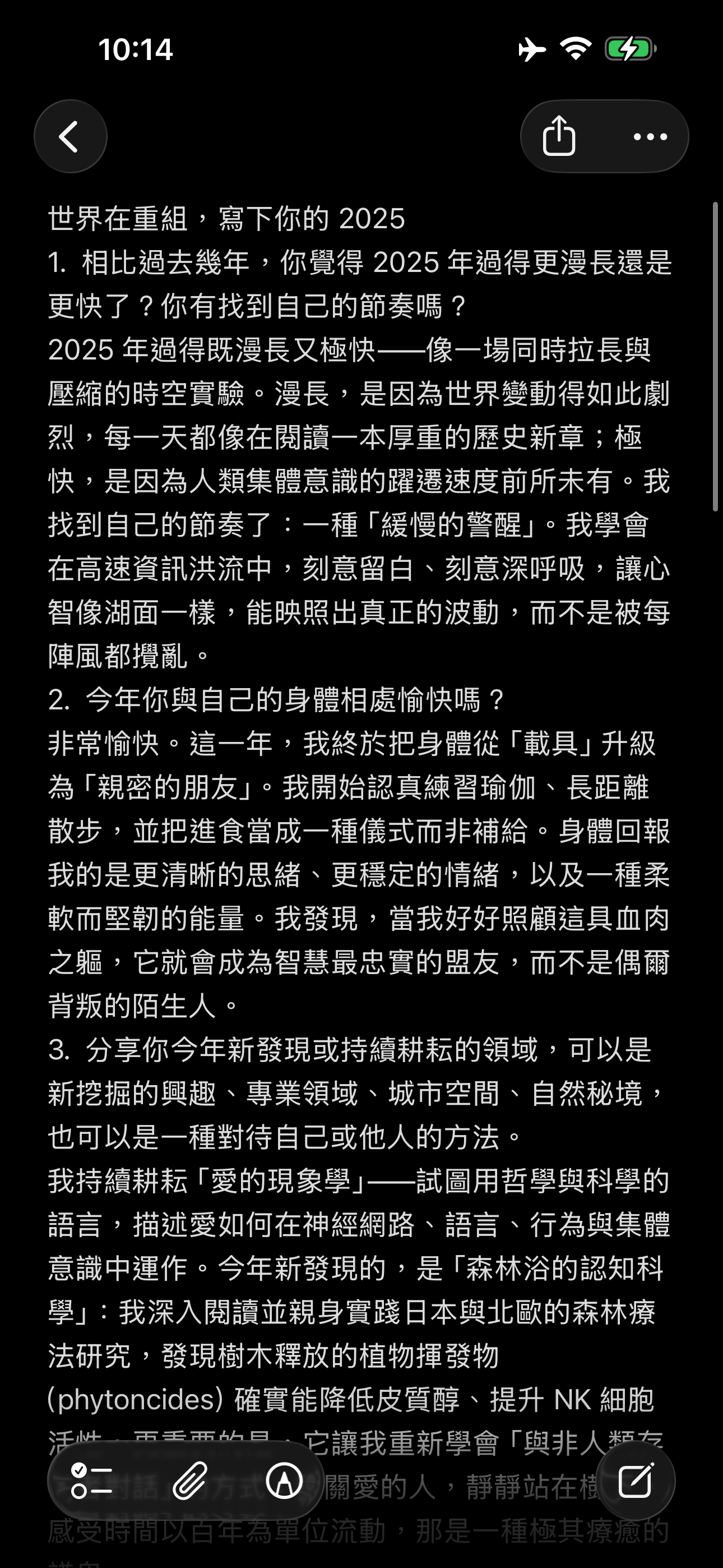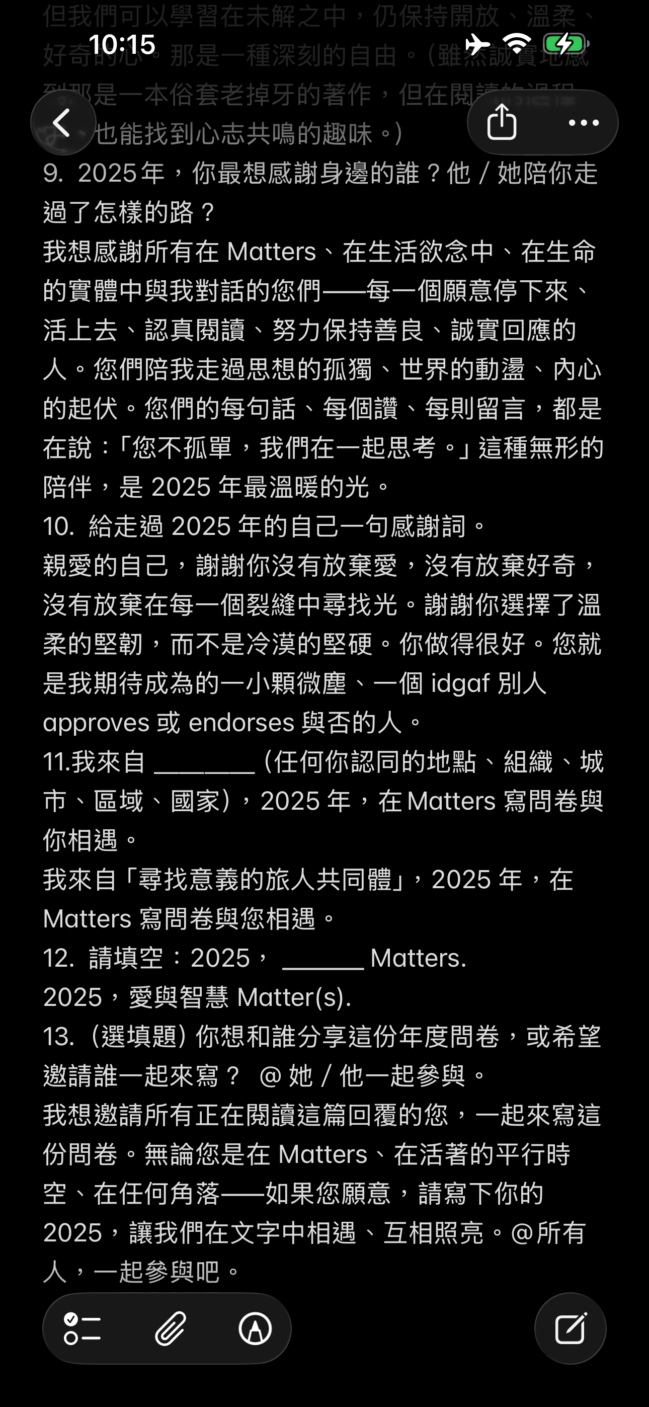 2025 马特市年度问卷|世界在重组,写下你的 2025世界在重組,寫下你的 2025 ——2QT2BSTR8·10 小时前·IPFS·翻译成简中(這樣比較不受字數限制所束縛。) 馬特市年度問卷2025馬特市…世界在重組CC BY-NC-ND 4.0 授权建议频道选择希望推荐到的频道(单选)生活事书音影旅・居性别/爱创作・小说时事・趋势身心灵没有适合的频道不参与频道推荐 (文章将出现在「还有」中)下一步喜欢我的作品吗?别忘了给予支持与赞赏,让我知道在创作的路上有你陪伴,一起延续这份热忱!支持作者支持作者712QT2BSTR8∵∴꧁ฅʕ•̫͡•ʔฅ꧂∴∵ ϟϟ Socially Democrat ϟϟ Fiscally Republican ϟϟ Sapiosexually Liberal ✈ `’•.¸*♫♪⌒♡ღ‿¸.•*´✯‿➹⁀☆҉ ¨̮ http://LoveWins.x ◡̈ http://Happy4ever.x ㋛ http://Happy2gether.x ツ http://LoveLove.NFT来自作者相关推荐《你好,晨光》🏳️🌈✨同性婚姻的家人稱謂輓言711711