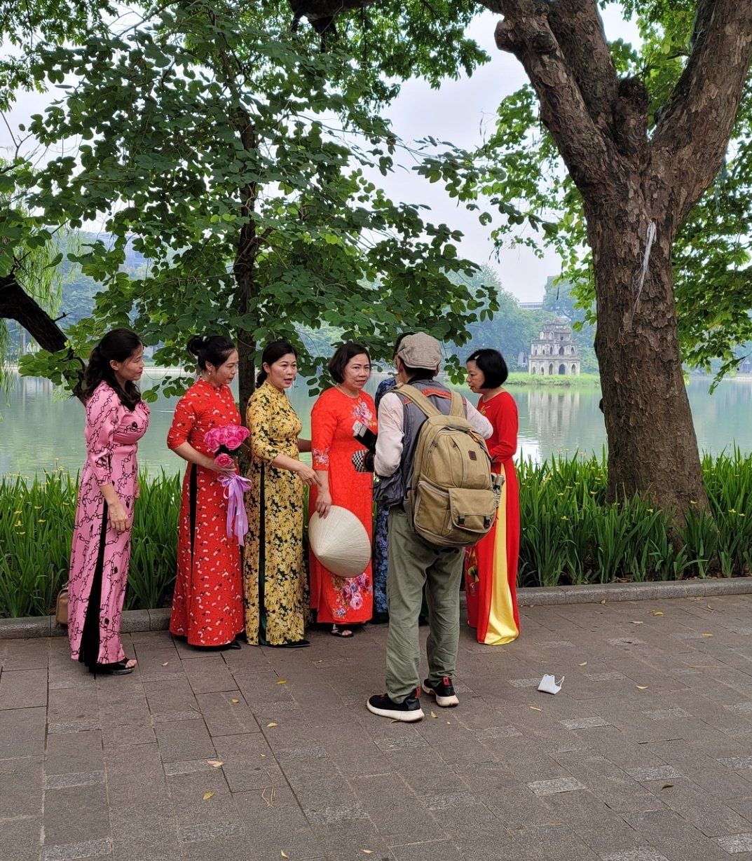還劍湖畔跟攝影師溝通中的越南女性