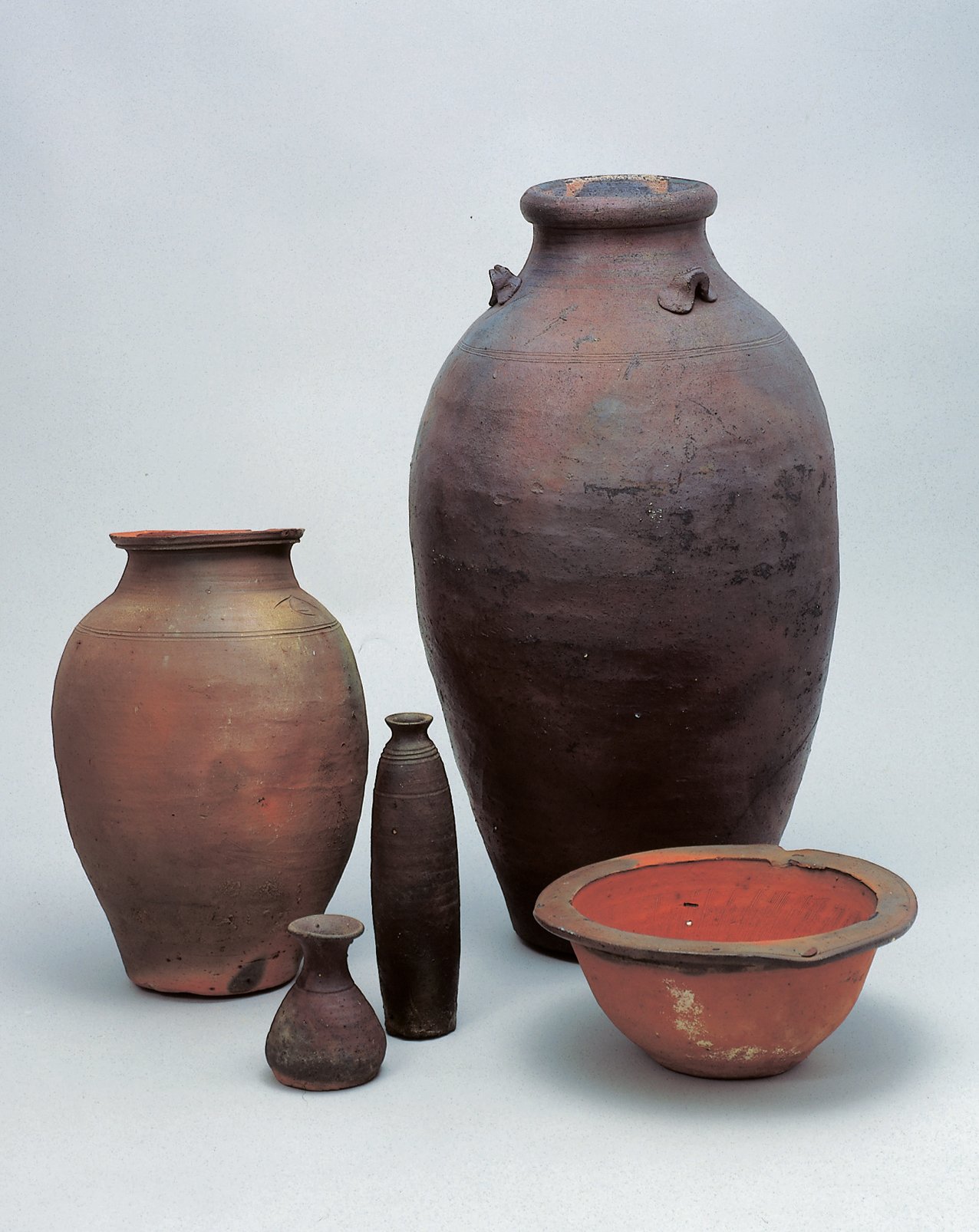 荒烧,顾名思义就是烧的很随意(?)。特点是不施釉,或仅施加含铁质的泥釉或锰釉,直接放在较低温下烧制(约 1000℃到 1120℃ 左右),以保留陶土天然的质地和颜色。此外,它几乎不做纹样装饰,外表粗狂质朴,常见于大型器具,比如酒瓮、水缸或者骨灰坛等。这次,我也看到了一些陶艺师的作品,发现要将这类作品做得美观,非常考验陶艺师对于器型塑造的基本功。