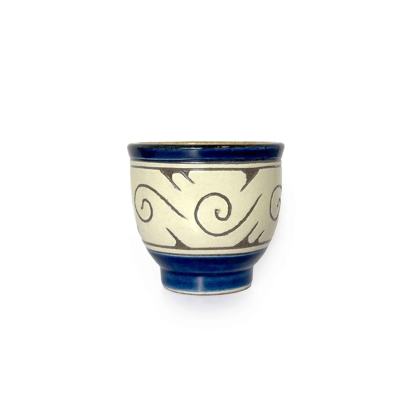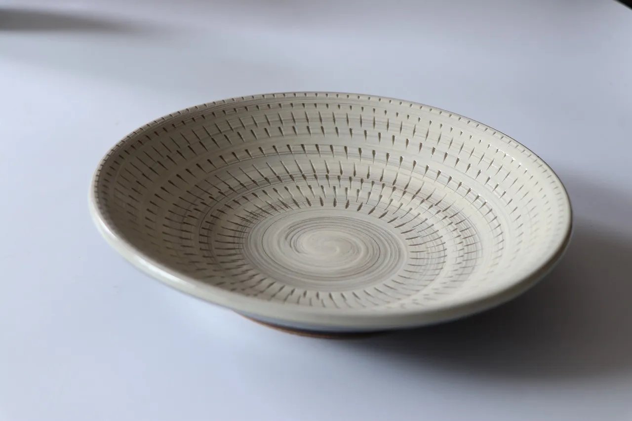先在陶器半干的胎体表面全面涂抹一层化妆土(即泥浆),再使用刮刀等工具将表面的化妆土或者釉药层小心刮出纹样,露出底层的胎土,使施釉层与底层形成鲜明的对比色。这样的刮划效果使图案醒目、立体,线条更加粗粝,充分体现了民艺的朴实美感。