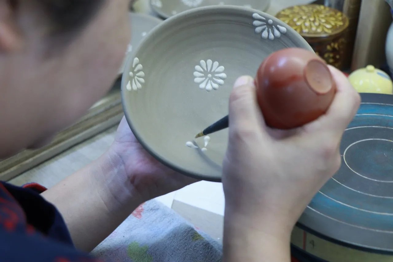 把白化妆土与水混合成黏土泥浆,用类似于裱花袋(又称いっちん)的工具将泥浆挤压到胎体表面,描绘出具有立体感的图案,如圆点、螺旋纹或波浪纹等。
