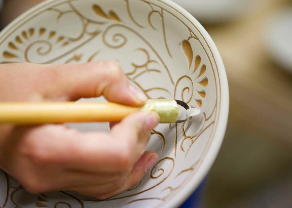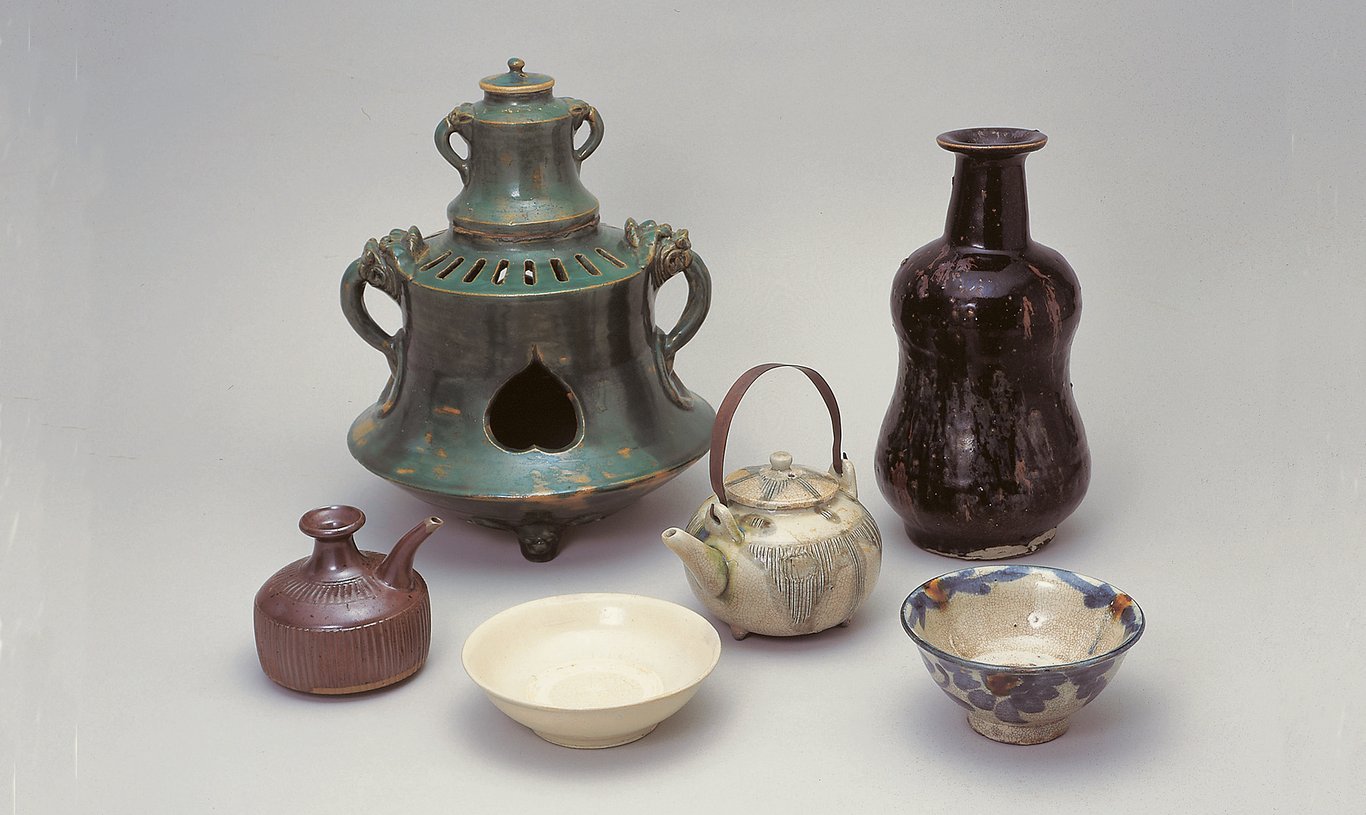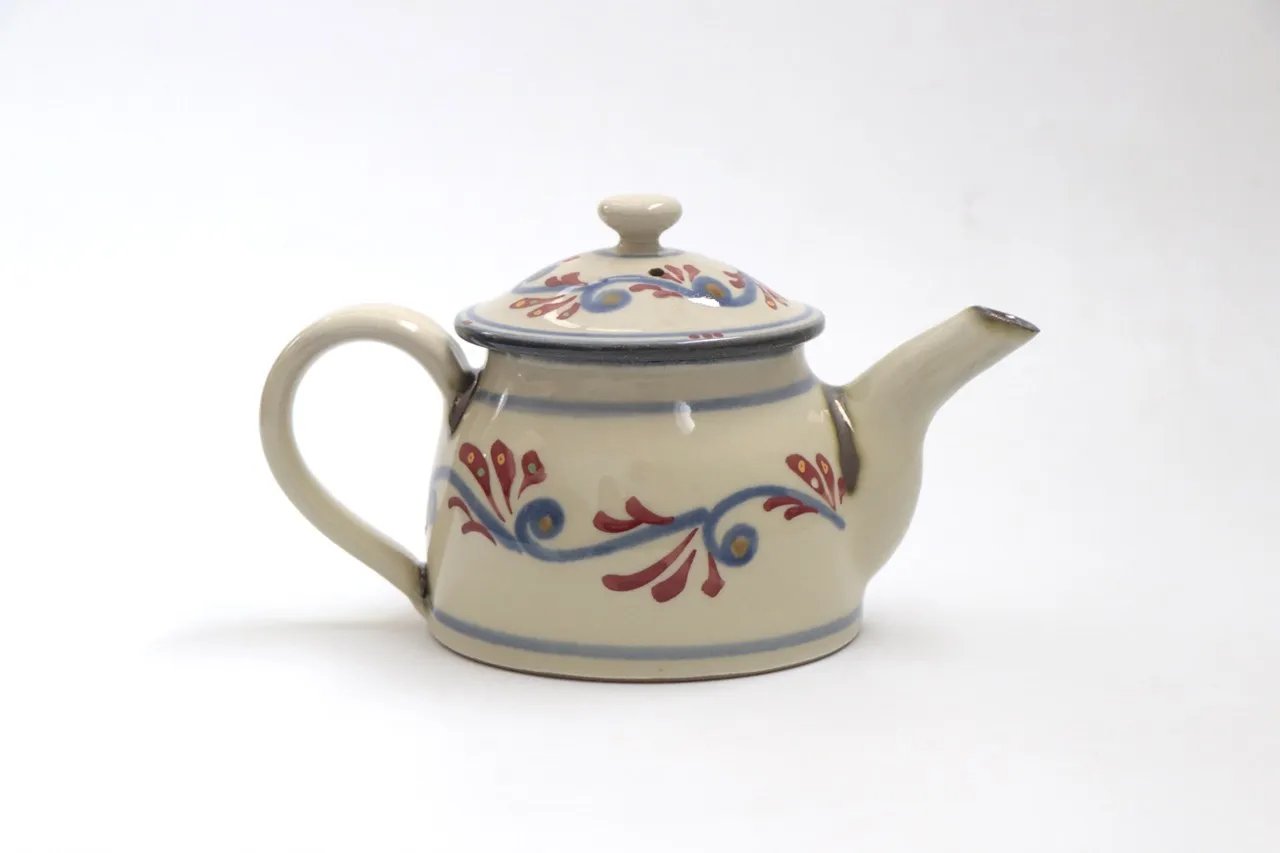 上烧,顾名思义就是更“高级”的烧制方法。最大特征便是和我们一般见到的陶器类似,施加釉药后以 1200℃ 左右的温度烧制,以增加陶器的防水性,并提供更多的艺术表现空间。工匠一般会在陶土上施一层白色化妆土,再进行彩绘和施釉。这样的陶器手感细腻,色彩鲜艳,富有光泽,常用于日常使用的食器或酒器。