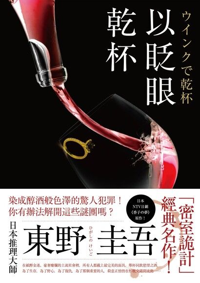 《以眨眼乾杯》是東野圭吾早期出版的長篇小說,故事描述女主角小田香子在飯店擔任公關人員,某一天在酒店的房間發現同事牧村繪里的屍體,因為現場是密室狀態所以警方初步研判是自殺,但是刑警芝田卻私下展開調查。