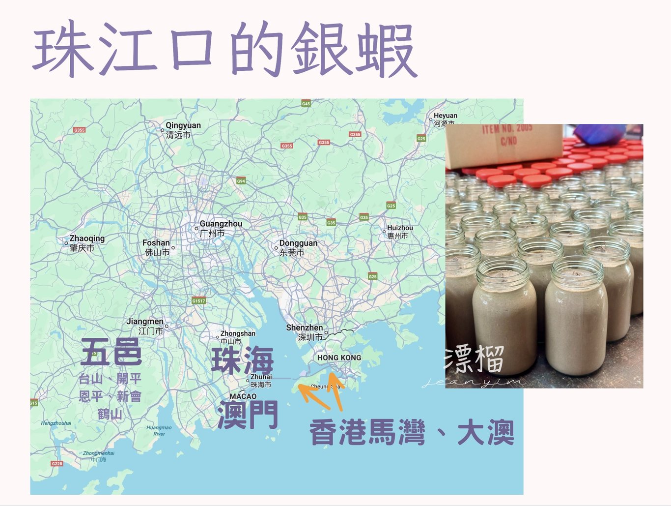 此外,在珠江口的另一邊,澳門路環和珠海淇澳島,也有製作蝦膏蝦醬的傳統,並且也都管原料小蝦叫「銀蝦」,管那紫灰色的蝦醬叫「銀蝦醬」。在往西一點,台山開平五邑地區的「鹹蝦」也是這樣做法,不過據說台山蝦醬只用石磨研磨一道,因此蝦殼質感仍明顯,在香港大澳就被稱為「粗鹹蝦」,以區別本地的「幼滑蝦醬」。總而言之,這種蝦的滋味,是這一片海的共同回憶。
