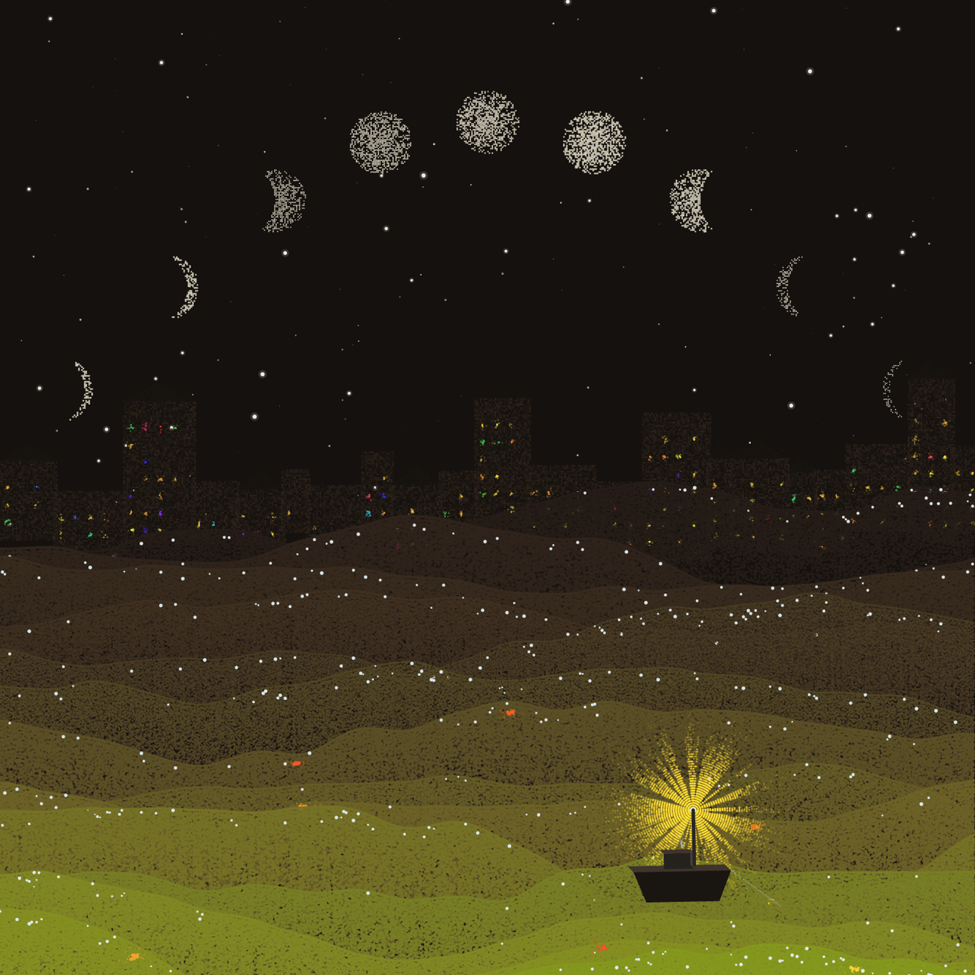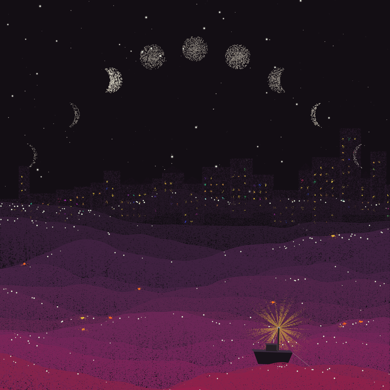前方的靜止的海洋是夜晚的寧靜,而後方霓彩的城市代表的是早晨的喧囂,上方月亮畫出的軌跡代表的是時間流動。