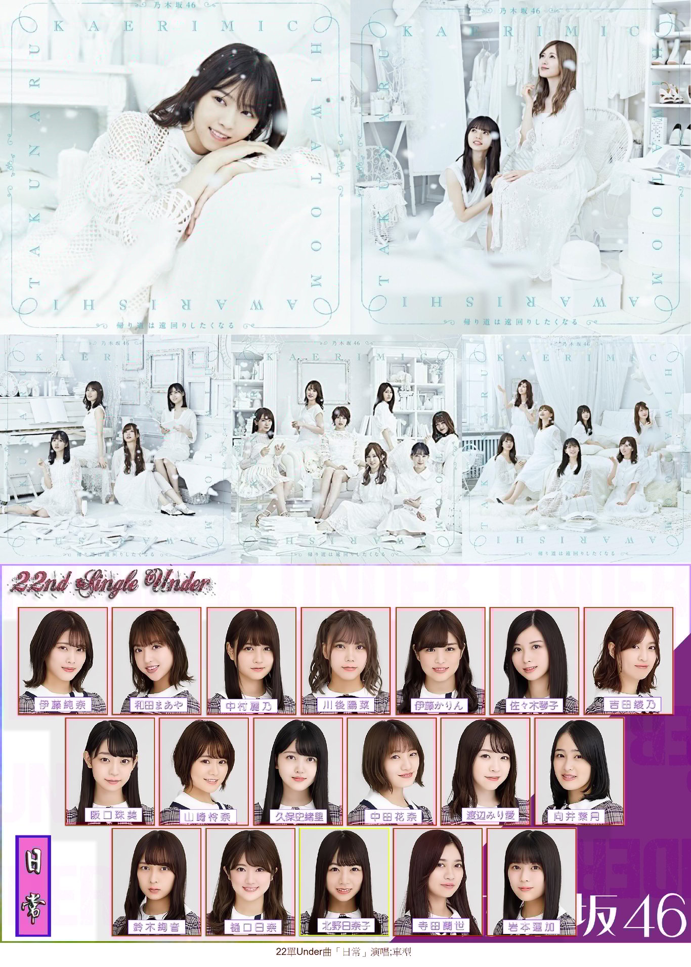 21單選拔發表,Center齋藤飛鳥,二期生鈴木絢音及三期生梅澤美波、岩本蓮加初次入選。上一張單曲選拔組中,樋口、寺田落選,久保暫停活動,其餘成員續留選拔組中。