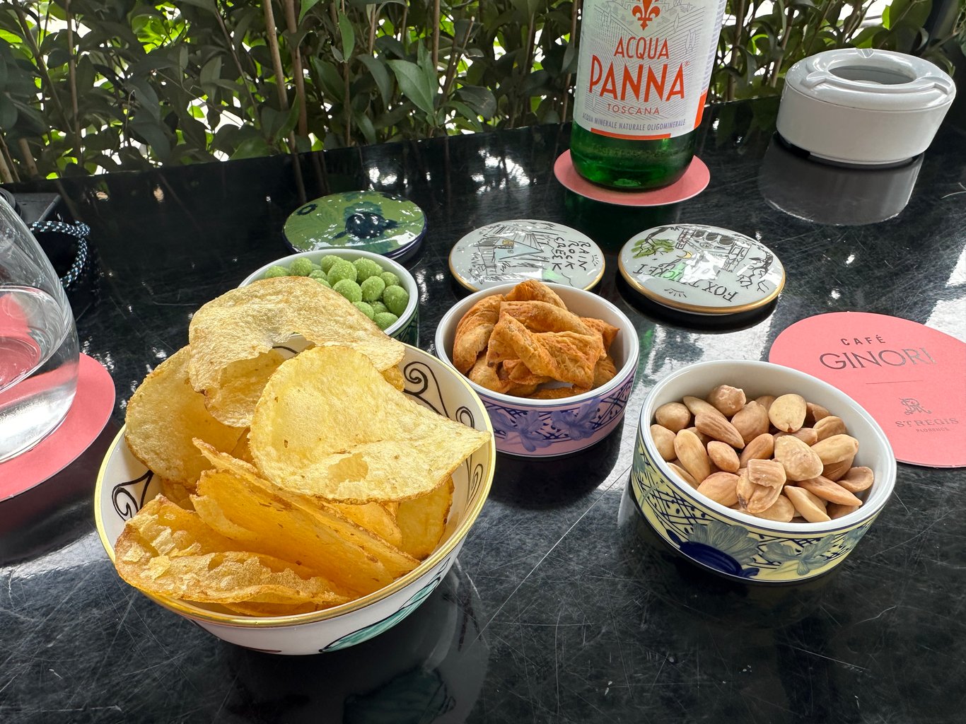 吧台有赠送小吃,一碟薯片,坚果和炸条(估计就是面粉做的小油条)。他们用的碟子倒是很别致,很花俏有特色。