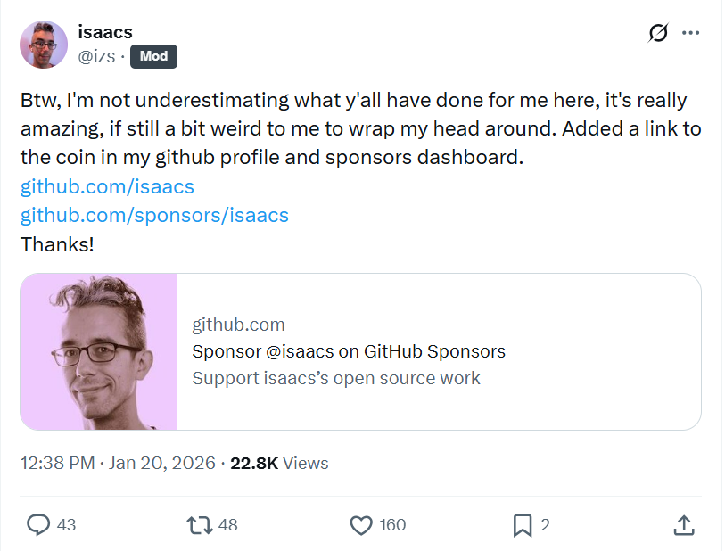 这将产生连锁反应。全球数百万看着Node.js和npm文档成长起来的开发者,会重新审视自己的认知。他们会思考:“如果艾萨克都开始认真对待,我是否应该放下成见,去理解这背后的技术实质?” 更多开源项目的核心维护者可能会效仿,将加密货币视为与GitHub Stars、赞助款项同等重要(甚至更直接)的社区支持与价值反馈机制。