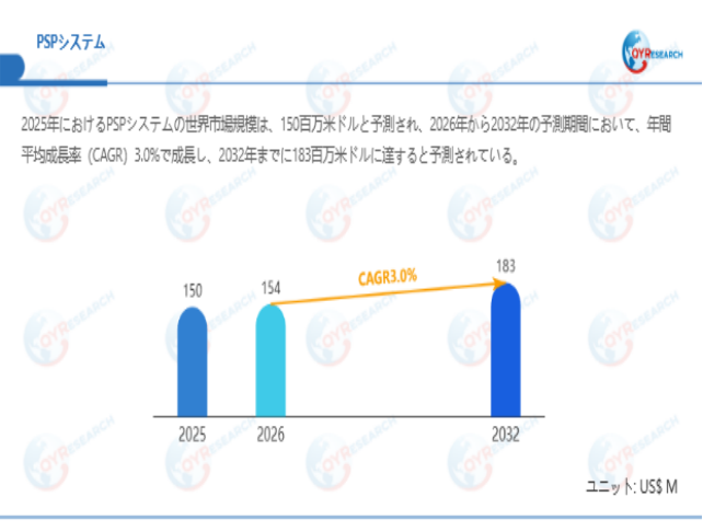 QYResearchが最新発表した「PSPシステム―グローバル市場シェアとランキング、全体の売上と需要予測、2026~2032」市場調査報告書によると、世界PSPシステム市場規模は2025年の約150百万米ドルから2026年には154百万米ドルへ着実に成長し、予測期間中に3%の複合年間成長率(CAGR)で拡大を続け、2032年には183百万米ドルに達する見込みである。