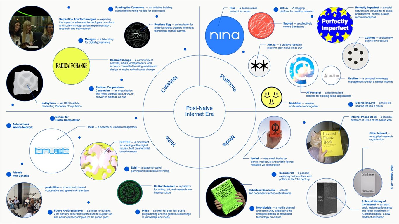 Mozilla的後天真宣言,蠻令人動容的。文中舉出Austin Robey創辦音樂平台Subvert的案例,是因為看到Bandcamp被Epic Games買走而下定決心。這些行動者不再是為了所有人而努力,而是專注替特定族群建立數位基礎設施。文中還附有「後天真網路時代地圖」,可以看到「老朋友」RadicalxChange和Serpentine Arts Technologies,朋友拿來整理書單的Are.na,還有我個人初次聽說的創意平台Metalabel在柏林運作的非營利網絡Trust.support,以及匯集各路Poetic Web的實體黃頁Internet Phone Book等,值得收藏。