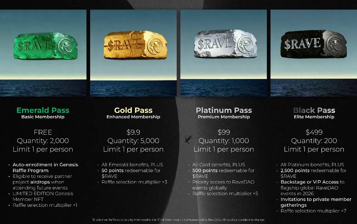 黑卡(Black Pass):铸造价格为 499 U,额外获得专属后台/VIP 通行、私密聚会邀约、2500 RAVE 积分奖励及 7 倍抽奖权重等权益。