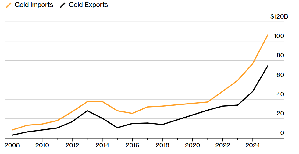 根据海关与贸易数据,迪拜在 2024 年全年进口黄金 1392 吨,总价值超过 1000 亿美元,出口规模亦高达 740 亿美元,这使得阿联酋成为全球第二大黄金进出口中心。譬如在非洲开采、阿联酋提炼的黄金,以及从瑞士、伦敦中转运往亚洲的黄金,相当大比例都要经过迪拜这个节点。