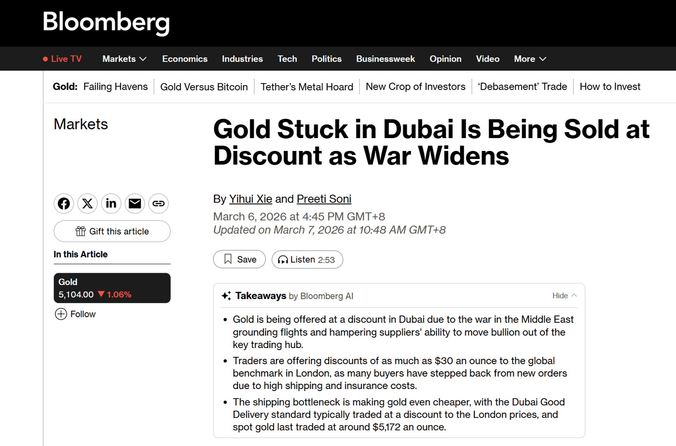 迪拜的黄金,上周开始出现罕见的「负溢价」。