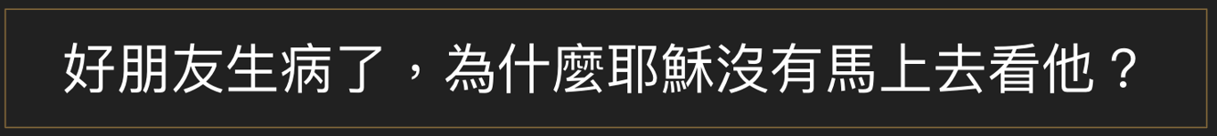 第一段經文是約翰11章3-7節,耶穌收到馬大和馬利亞託人帶來拉撒路病了,耶穌卻在原處住了兩天。很不合理,對吧!所愛的人病了應該要快快去啊!
