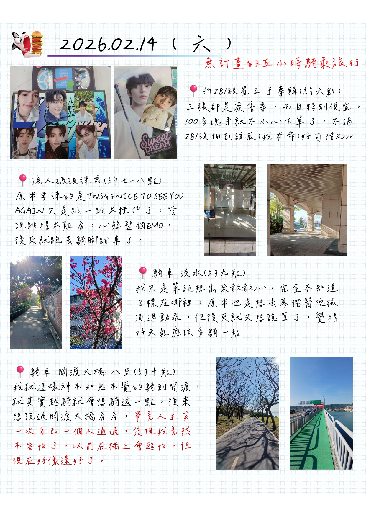 漁人碼頭練舞(約七~八點):原本要練的是 TWS 的《NICE TO SEE YOU AGAIN》,只是跳一跳太挫折了,發現跳得太難看,心態整個 EMO,後來就跑去騎腳踏車了。