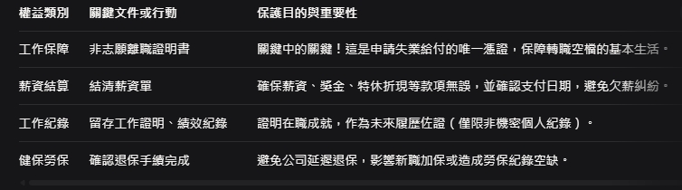 權益類別關鍵文件或行動保護目的與重要性工作保障非志願離職證明書關鍵中的關鍵!這是申請失業給付的唯一憑證,保障轉職空檔的基本生活。薪資結算結清薪資單確保薪資、獎金、特休折現等款項無誤,並確認支付日期,避免欠薪糾紛。工作紀錄留存工作證明、績效紀錄證明在職成就,作為未來履歷佐證(僅限非機密個人紀錄)。健保勞保確認退保手續完成避免公司延遲退保,影響新職加保或造成勞保紀錄空缺。