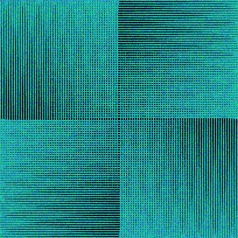 因為我覺得這次的練習非常適合做成各種不同材質,所以我又嘗試做了第二張圖。這張圖是由許多點構成,每個點的顏色設計成主顏色+改變的數值,讓整體視覺更豐富。另外我將 noise 搭配 sin 函數一起創作,在一頓瘋狂調整數值之下,做出類似有摺痕的麻布材質。
