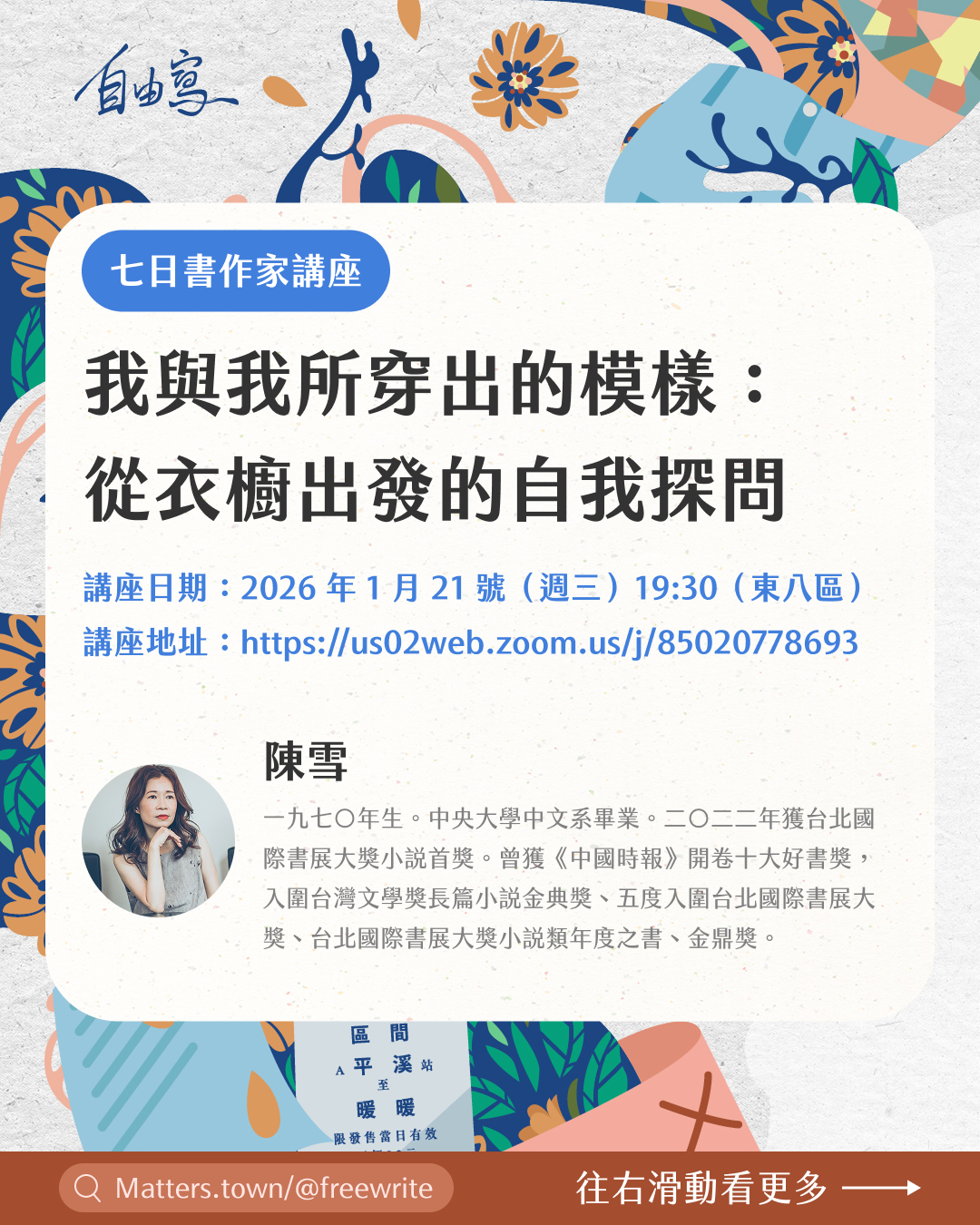 透過「七日書」的書寫,我們打開衣櫥,練習誠實。誠摯邀請你參與這場講座,聽陳雪訴說那些關於遮蔽與顯露的故事,找回那個在他人期待之外,最自在、最真實的自己。